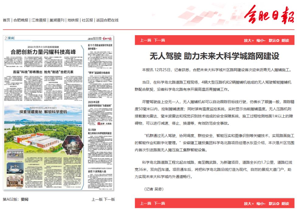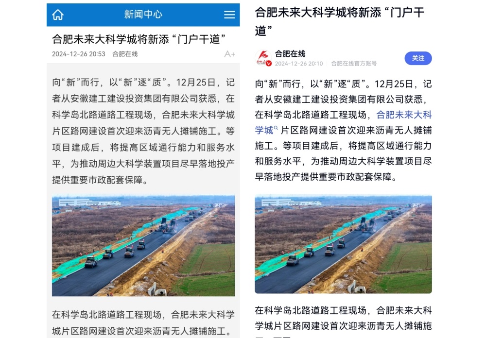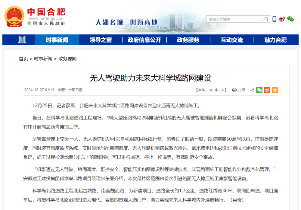 12月25日,建工建投集團(tuán)合肥市科學(xué)島北路等4條道路工程項(xiàng)目瀝青下面層無人攤壓施工順利進(jìn)行。《合肥日?qǐng)?bào)》、合肥在線等媒體深入項(xiàng)目一線展開報(bào)道,稿件登上合肥市政府官網(wǎng)首頁。