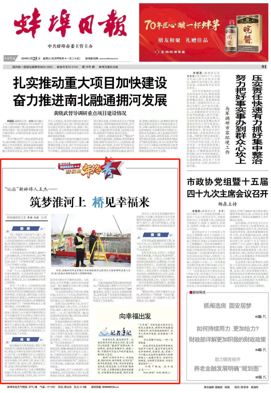 近日,蚌埠日?qǐng)?bào)頭版專題報(bào)道安徽水利延安路淮河大橋項(xiàng)目員工王杰扎根基層、以青春之姿勇挑重?fù)?dān)的奮斗故事。