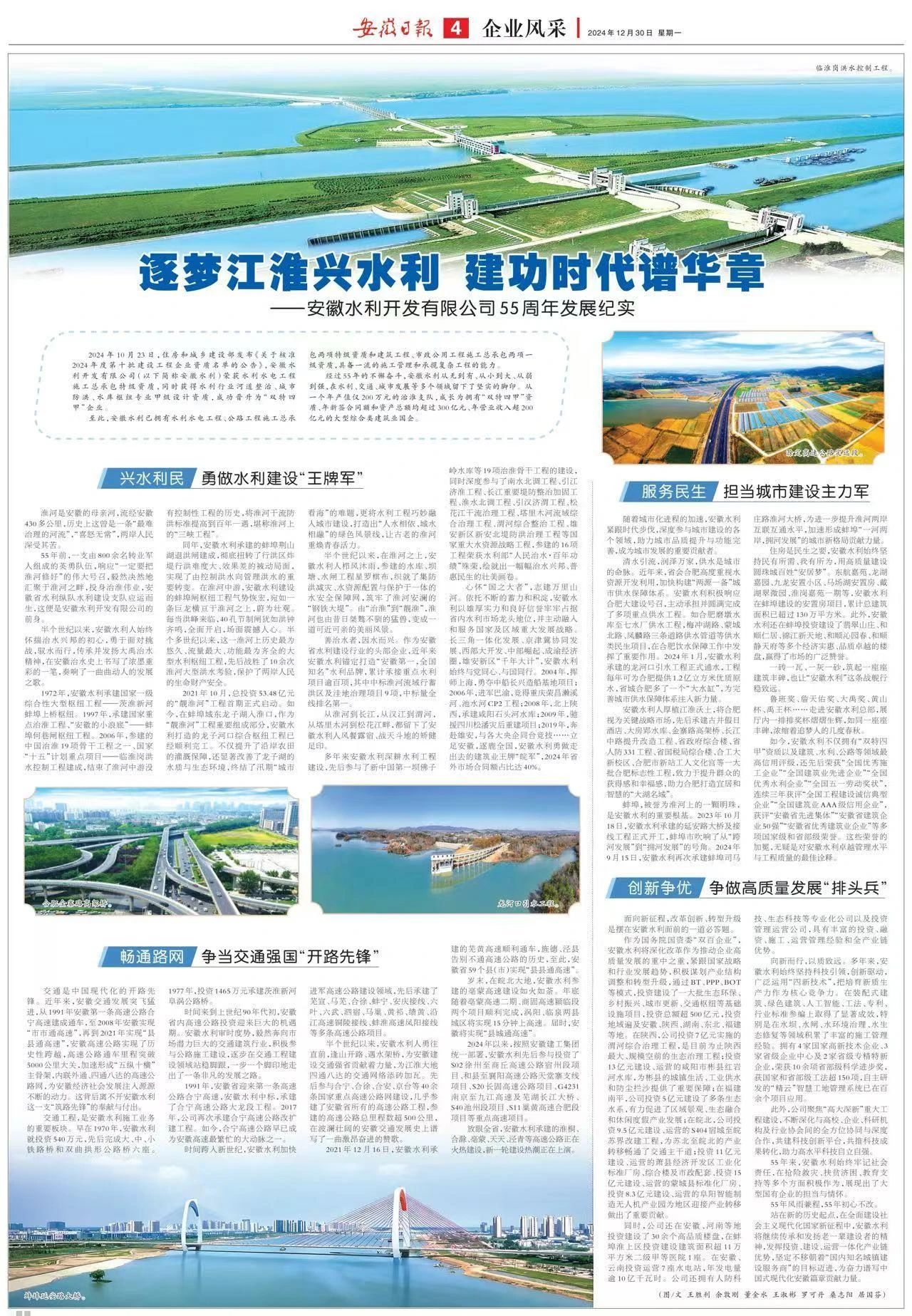 12月30日,是安徽水利開發(fā)有限公司五十五歲生日。安徽日報以《逐夢江淮興水利 建功時代譜華章——安徽水利開發(fā)有限公司55周年發(fā)展紀實》為題,專欄報道安徽水利五十五年發(fā)展歷程及取得的成績。全文如下: