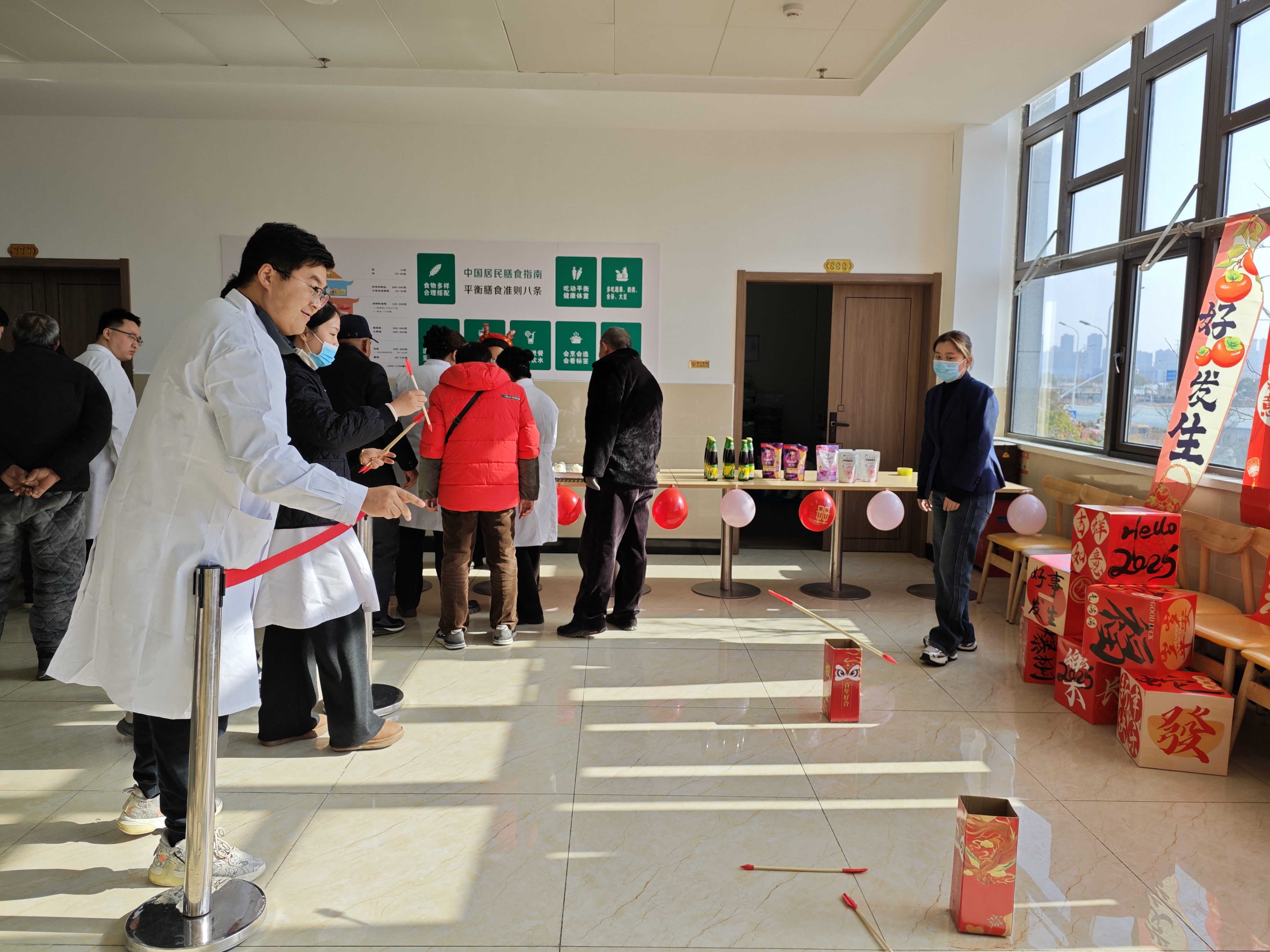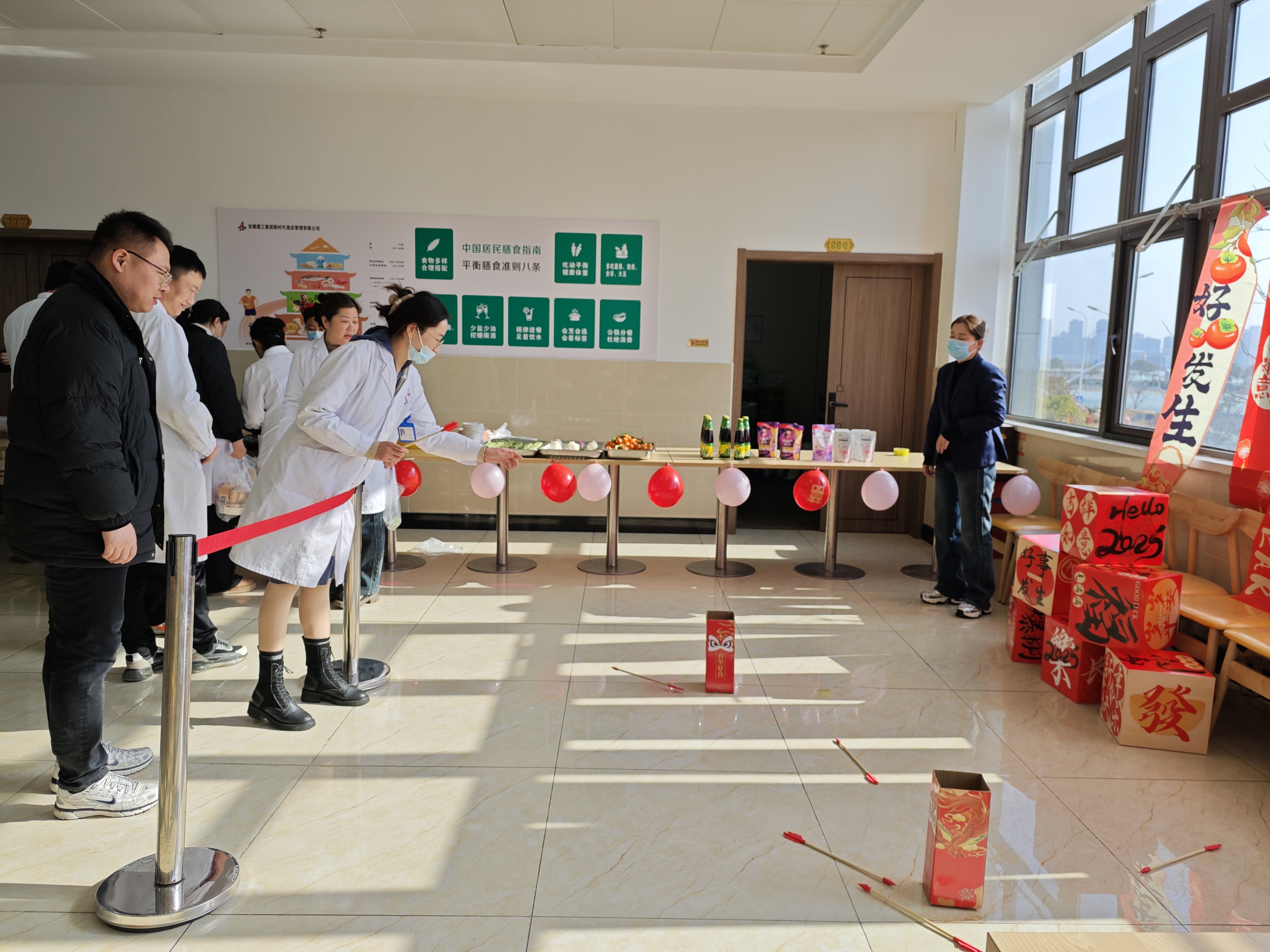 活動現場,食堂精心準備了各式各樣的美食,包括香氣四溢的鹵味、新鮮可口的菜肴,供大家自由選購;還免費提供新鮮的水果和五顏六色的果蔬小饅頭,供大家品嘗。在品嘗美食的同時,還能參與游戲——“投壺納?!?,獲得獎品?!皦亍迸c“福”是諧音,寓意著大家在新的一年里福星高照、福氣臨門。醫(yī)院到處洋溢著跨年的喜悅氣氛,大家懷著愉悅的心情,共同迎接新年的到來!