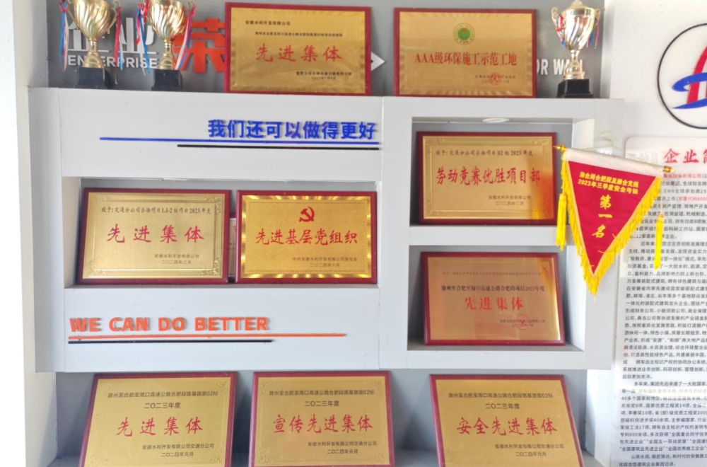 項(xiàng)目先后獲得合肥市交投“2022、2023年度“先進(jìn)集體”榮譽(yù)稱號(hào)、安徽建工2024上半年“流動(dòng)紅旗”黨組織項(xiàng)目部、安徽水利“先進(jìn)集體、勞動(dòng)競(jìng)賽優(yōu)勝項(xiàng)目部”“先進(jìn)基層黨組織”等榮譽(yù)稱號(hào)。