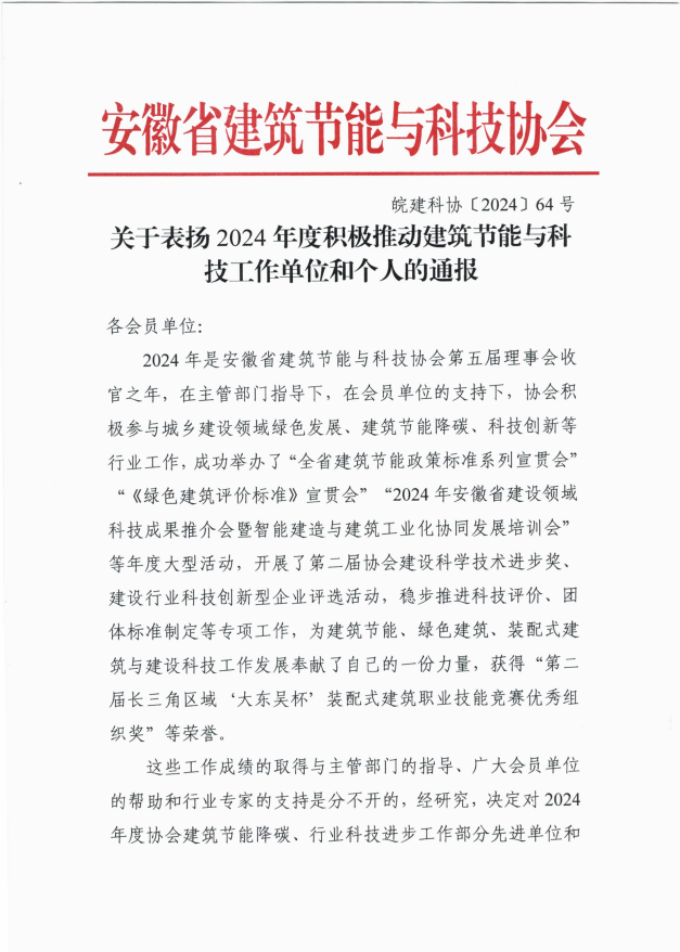 日前,安徽省建筑節(jié)能與科技協(xié)會(huì)發(fā)布通報(bào),安徽?。ㄊ徍┙ㄖ鈨?chǔ)一體化專業(yè)委員會(huì)被評(píng)為先進(jìn)單位,公司楊海峰被評(píng)為先進(jìn)個(gè)人。