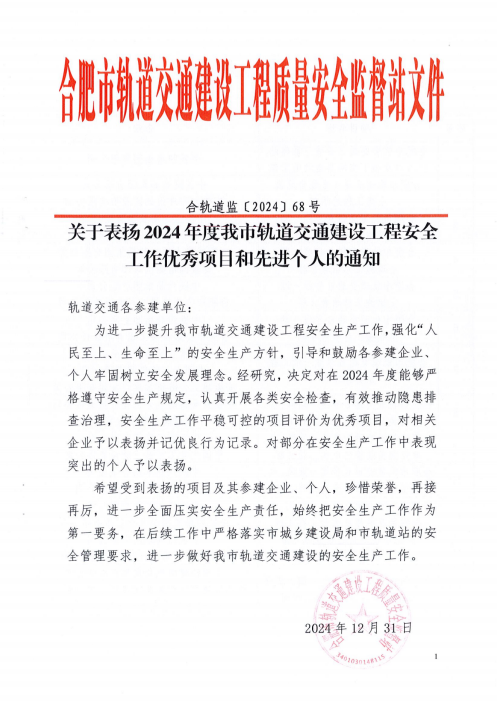 近日,建工路港軌道交通7號線項目榮獲2024年度合肥市軌道交通建設(shè)工程“安全工作優(yōu)秀項目”稱號,項目經(jīng)理被授予“安全工作先進(jìn)個人”稱號。