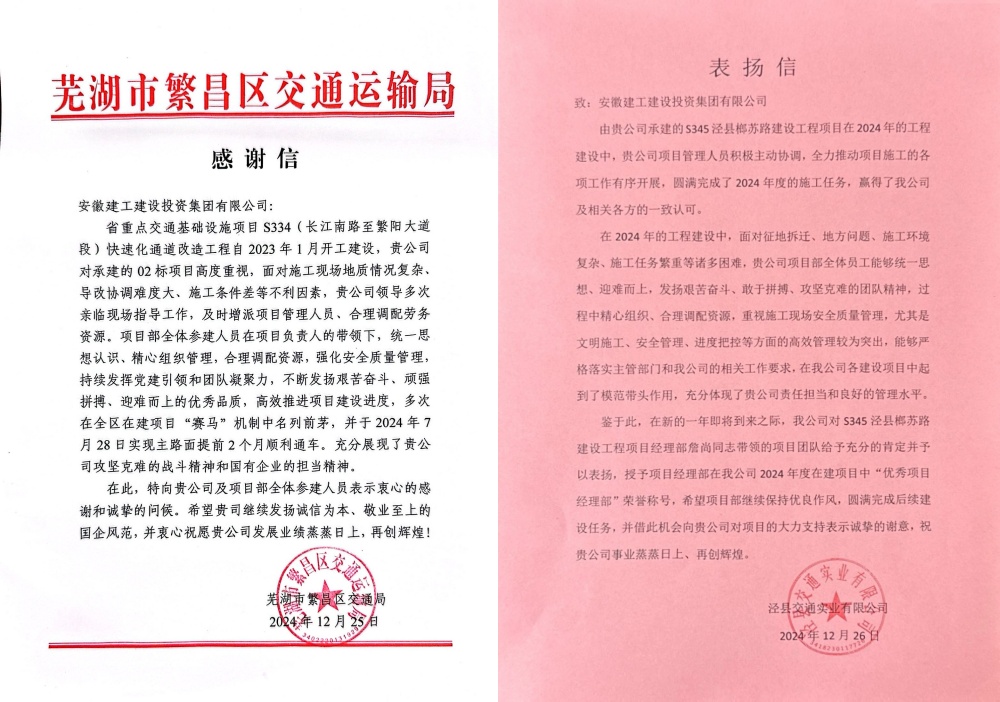 表揚信中指出,S334(長江南路至繁陽大道段)快速化通道改造工程02標(biāo)項目開工以來,面對施工現(xiàn)場地質(zhì)情況復(fù)雜、導(dǎo)改協(xié)調(diào)難度大、施工條件差等不利因素,公司領(lǐng)導(dǎo)多次親臨現(xiàn)場指導(dǎo)工作,及時增派項目管理人員、合理調(diào)配勞務(wù)資源,項目負責(zé)人帶領(lǐng)項目部全體參建人員,統(tǒng)一思想認識、精心組織管理,合理調(diào)配資源,強化安全質(zhì)量管理,高效推進項目建設(shè)進度,多次在全區(qū)在建項目“賽馬”機制中名列前茅,并于2024年7月28日實現(xiàn)主路面提前2個月順利通車,充分體現(xiàn)了我公司攻堅克難的戰(zhàn)斗精神和國有企業(yè)的擔(dān)當(dāng)精神;S345涇縣榔蘇路項目在工程建設(shè)中,面對征地拆遷、地方問題、施工環(huán)境復(fù)雜、施工任務(wù)繁重等諸多困難,項目部全體員工能夠統(tǒng)一思想、迎難而上,發(fā)揚艱苦奮斗、敢于拼搏、攻堅克難的團隊精神,過程中精心組織、合理調(diào)配資源,重視施工現(xiàn)場安全質(zhì)量管理,尤其是文明施工、安全管理、進度把控等方面的高效管理較為突出,能夠嚴格落實主管部門和業(yè)主單位的相關(guān)工作要求,在業(yè)主單位的各建設(shè)項目中起到了模范帶頭作用,充分體現(xiàn)了我公司的責(zé)任擔(dān)當(dāng)和良好的管理水平。