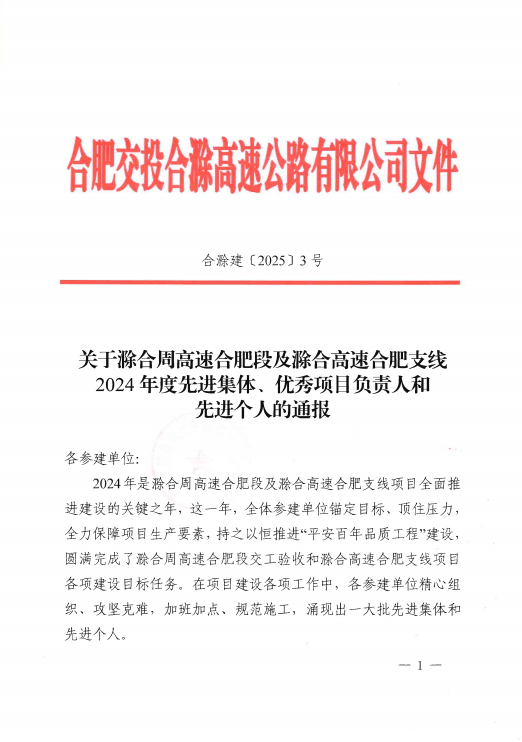 近日,合肥交投合滁高速公路舉辦2024年度總結(jié)大會(huì)暨表彰大會(huì)。滁合支線項(xiàng)目榮獲2024年度“先進(jìn)集體”稱號(hào),徐海東同志榮獲“優(yōu)秀項(xiàng)目負(fù)責(zé)人”稱號(hào),張興強(qiáng)、王盛楠、耿貝貝同志榮獲先進(jìn)個(gè)人稱號(hào)。
