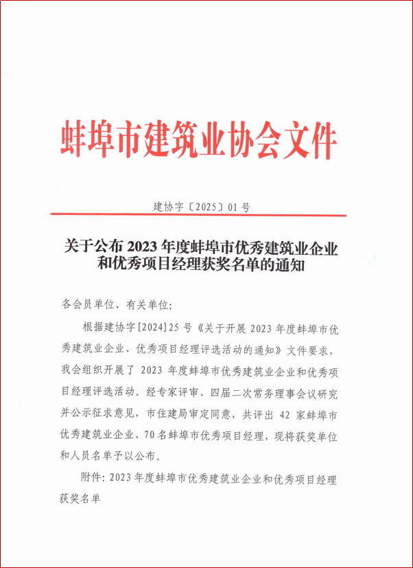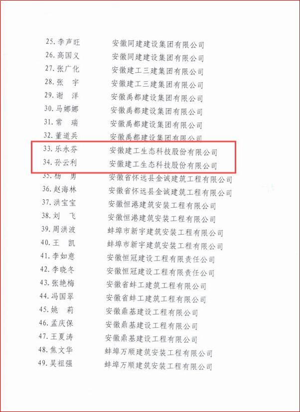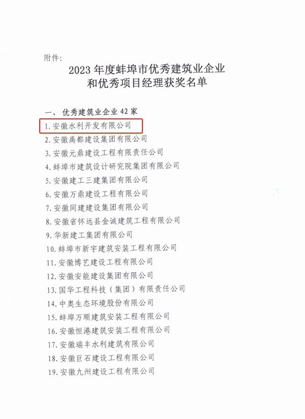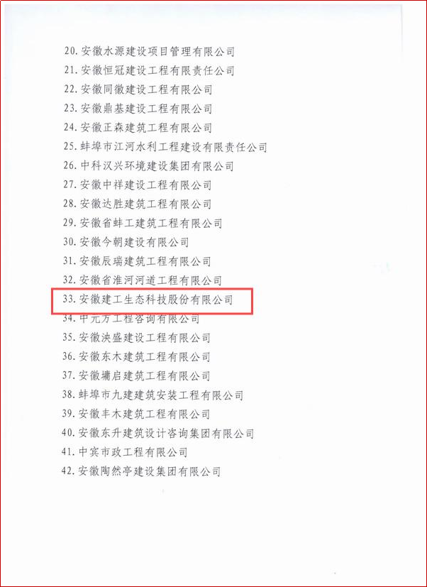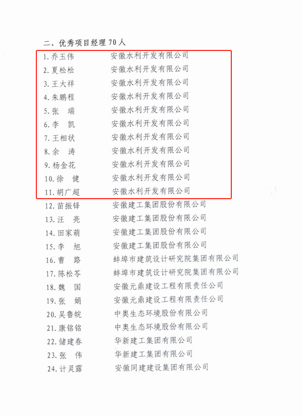 近日,蚌埠市建筑業(yè)協(xié)會(huì)專(zhuān)家評(píng)審委員會(huì)公布評(píng)選結(jié)果,安徽水利及所屬安徽建工生態(tài)科技股份有限公司獲評(píng)2023年度“蚌埠市優(yōu)秀建筑企業(yè)”,安徽水利員工喬玉偉、夏松松、王大祥、朱鵬程、張瑞、李凱、王相狀、余濤、楊金花、徐健、胡廣超、樂(lè)永芬、孫云利等13人榮獲“蚌埠市優(yōu)秀項(xiàng)目經(jīng)理”稱(chēng)號(hào)。