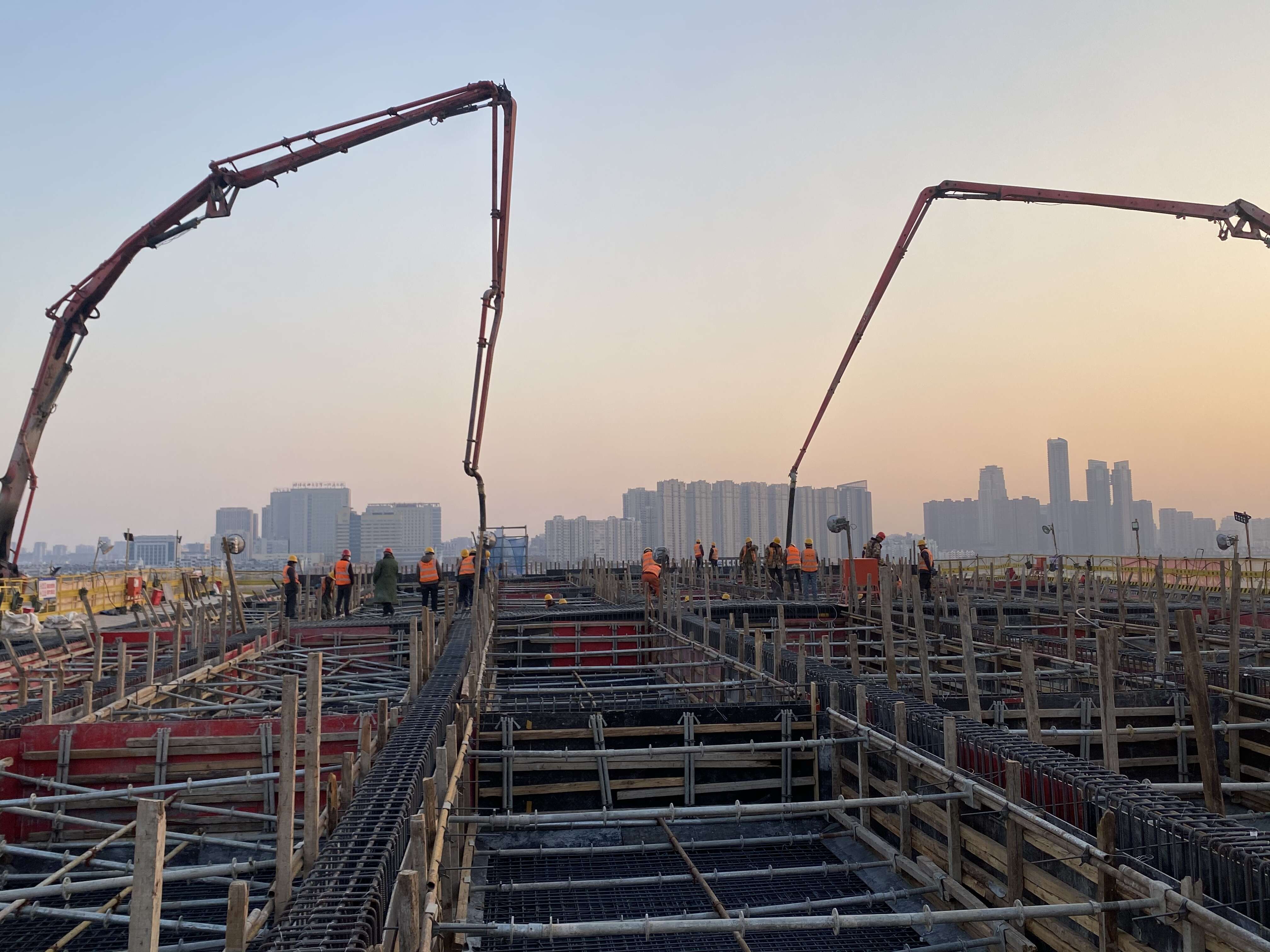 為確保此次大方量混凝土澆筑順利進(jìn)行,項(xiàng)目部制定了詳細(xì)的施工方案,多次召開(kāi)交流會(huì)和交底會(huì),對(duì)人員組織、機(jī)械和材料準(zhǔn)備、施工安全、混凝土質(zhì)量控制以及后勤保障等各個(gè)方面進(jìn)行了周密的安排,確保對(duì)澆筑過(guò)程的精確控制。在澆筑過(guò)程中,通過(guò)“白+黑”輪班模式,技術(shù)人員全程監(jiān)督,實(shí)時(shí)監(jiān)控施工進(jìn)度與質(zhì)量,確了保施工連續(xù)性。在全體人員的密切配合下,施工作業(yè)一氣呵成,成功完成了澆筑任務(wù)。澆筑完成后,項(xiàng)目采用覆蓋塑料薄膜蒸汽養(yǎng)護(hù)法進(jìn)行了后續(xù)混凝土養(yǎng)護(hù),確?;炷翉?qiáng)度穩(wěn)步增長(zhǎng)。