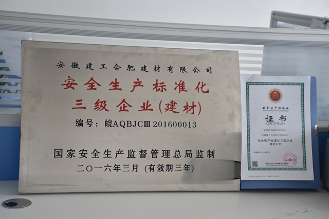 2016年1月15日,安徽建工合肥建材有限公司(以下簡稱合肥建材)順利通過肥西縣安監(jiān)局、桃花工業(yè)園管委會安監(jiān)局及安全標(biāo)準(zhǔn)化評審專家組的現(xiàn)場驗收和評審;2016年3月28日,報經(jīng)合肥市安全生產(chǎn)監(jiān)督管理局核準(zhǔn);2016年6月8日,合肥建材被合肥市安全生產(chǎn)監(jiān)督管理局授予“安全生產(chǎn)標(biāo)準(zhǔn)化三級企業(yè)(建材)”稱號,并頒發(fā)證書和銘牌。