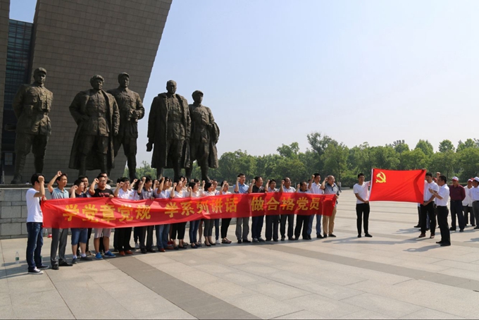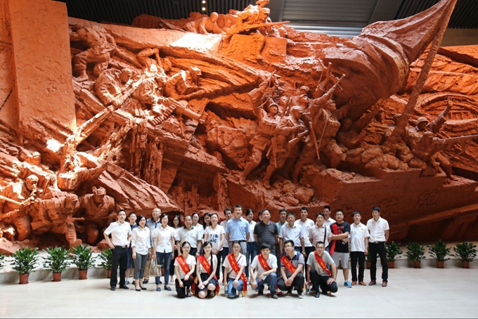 在渡江戰(zhàn)役紀(jì)念館雕像前,在交航公司機關(guān)支部委員帶領(lǐng)下,大家面對鮮紅的黨旗舉起右拳,莊嚴(yán)宣誓。