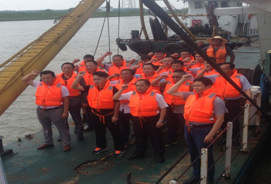 2016年6月23日下午,安徽省交通航務(wù)工程有限公司副總經(jīng)理汪崇龍、疏浚分公司總經(jīng)理董雙武等分公司領(lǐng)導(dǎo)一行蒞臨青弋江疏挖工程項(xiàng)目視察,汪崇龍一行檢查了項(xiàng)目各施工船舶的安全生產(chǎn)情況,隨后在皖蛟龍?zhí)柹相嵵嘏e行了安全宣誓活動(dòng)。宣誓由疏浚分公司副經(jīng)理商顯鋒領(lǐng)誓疏浚分公司領(lǐng)導(dǎo)及各項(xiàng)目部負(fù)責(zé)人、船隊(duì)代表參加宣誓。