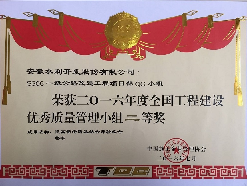 中國施工企業(yè)管理協(xié)會(huì)組織的2016年度工程建設(shè)質(zhì)量管理小組代表會(huì)議于7月5日在廈門召開。會(huì)上,安徽水利交通公司S306一級(jí)公路改造工程QC小組發(fā)布的課題《提高新老路基結(jié)合部驗(yàn)收合格率》榮獲二等獎(jiǎng)。