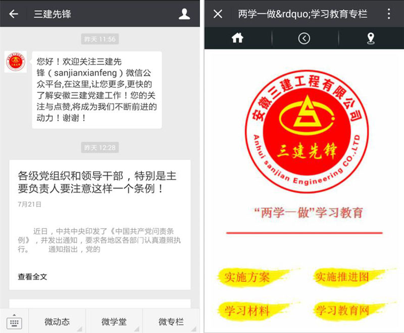 為扎實(shí)開展好“兩學(xué)一做”學(xué)習(xí)教育,擴(kuò)大黨員教育和黨建宣傳的覆蓋面,在中國(guó)共產(chǎn)黨建黨95周年之際,安徽三建公司黨委結(jié)合當(dāng)前微信普及率高、信息傳遞快的特點(diǎn),創(chuàng)新黨建工作方法,開通安徽三建黨建工作微信公眾平臺(tái)—“三建先鋒”公眾號(hào),“黨建+”工作模式正式啟動(dòng)。