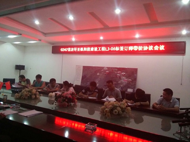 7月25日, 安徽路港G347普濟(jì)圩至樅陽段建設(shè)工程LJ-06標(biāo)項(xiàng)目部在會議室舉行“師帶徒”協(xié)議簽訂儀式。在項(xiàng)目部全體成員的共同見證下,6對師徒在《師帶徒協(xié)議書》上莊重地簽下了自己的名字,涉及技術(shù)員、試驗(yàn)員、財(cái)務(wù)等多個崗位。