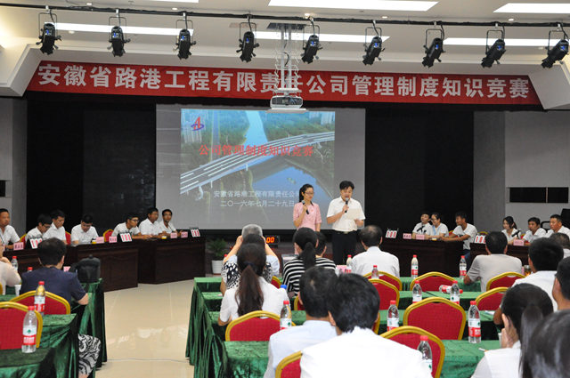為提高安徽路港公司廣大員工學習公司管理制度的自覺性,營造濃厚的學習氛圍,保障公司管理制度的貫徹執(zhí)行,助推公司持續(xù)、穩(wěn)定、健康發(fā)展,7月29日下午,安徽路港公司在安建大廈3樓會議室舉辦公司管理制度知識競賽。來自公司所屬各單位、項目部的22支代表隊共66名選手參加比賽。本次競賽邀請了集團公司工會副主席吳曉伍到會指導(dǎo)并擔任裁判。安徽路港公司董事長李振標、黨委副書記馬斌、副總經(jīng)理袁民、紀委書記、工會主席干戈、財務(wù)總監(jiān)章興紅出席。