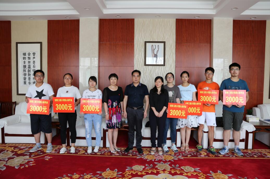 為進一步弘揚社會主義核心價值觀,切實履行國企社會責任,8月24日上午,在各大高校開學前夕,安徽三建公司“愛心助學”活動捐贈儀式在該司貴賓接待室舉行,10名困難職工家庭的子女接受了公司的愛心資助,安徽三建公司董事長、總經(jīng)理左登宏、黨委副書記、紀委書記黃麗春、工會主席唐永慧參加捐贈儀式,并為每位同學送上3000元助學金,捐助金額累計達3萬元。